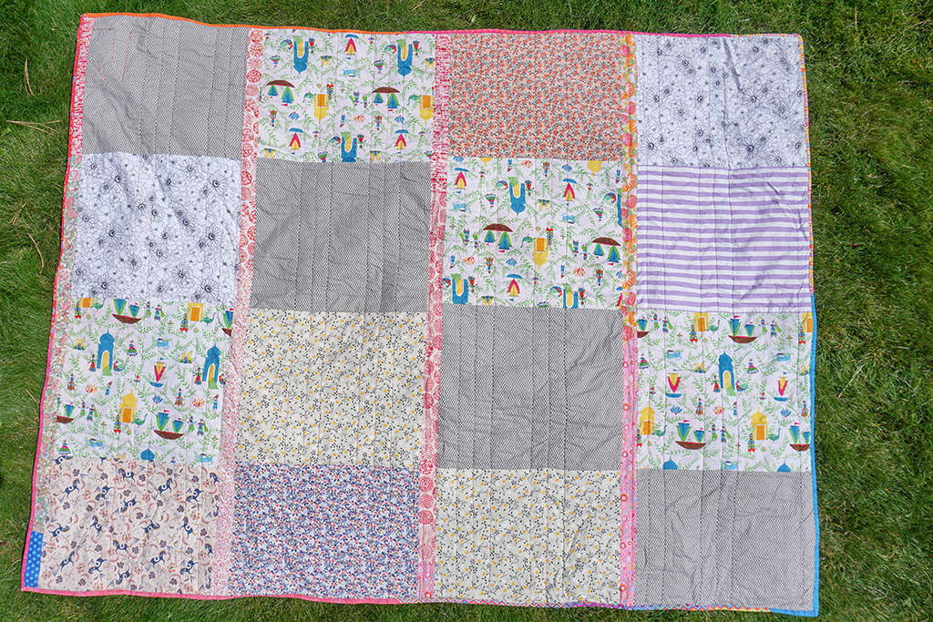 There was a lot of shifting when I quilted it and the back ended up being too short, so I had to sew on this little strip of floral fabric in the middle of quilting it.
