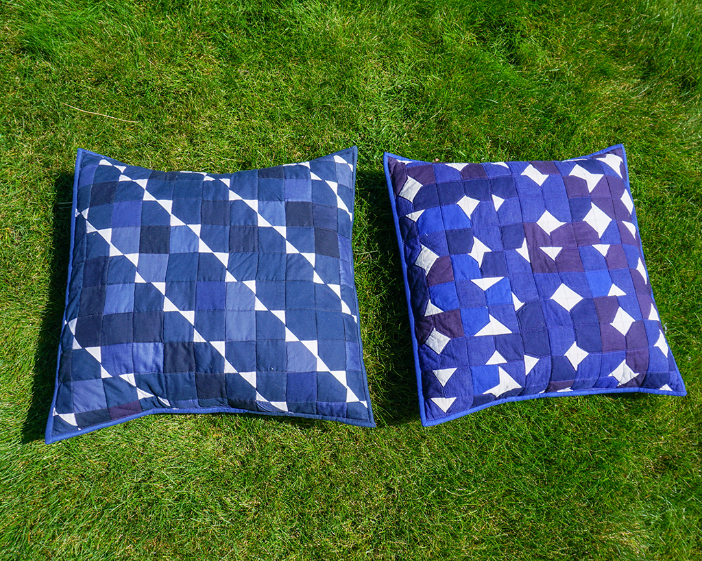Quilting: for the diagonal stripey one I am pretty sure I just stitched in the ditch with a walking foot. For the other one I used a darning foot to outline the triangles as best I could.