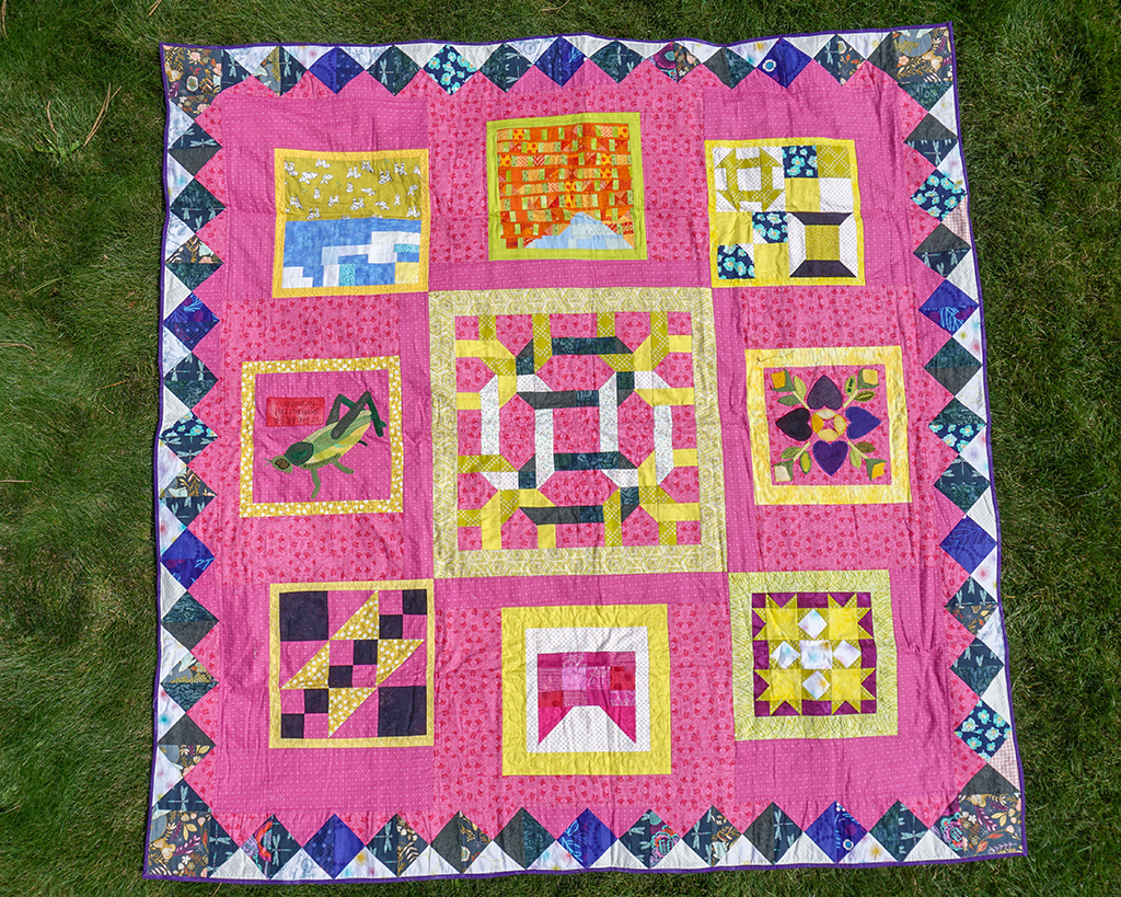Pattern: It was a sort of choose your own adventure BOM deal. Some of them are based on where you are from, what you believe in (I went with a pussy hat, designed the block myself) or something you love (a tribute to my beloved Theresa, my pet cricket). I like that the finishing instructions let you sash stuff however so you could bring everything up to size.